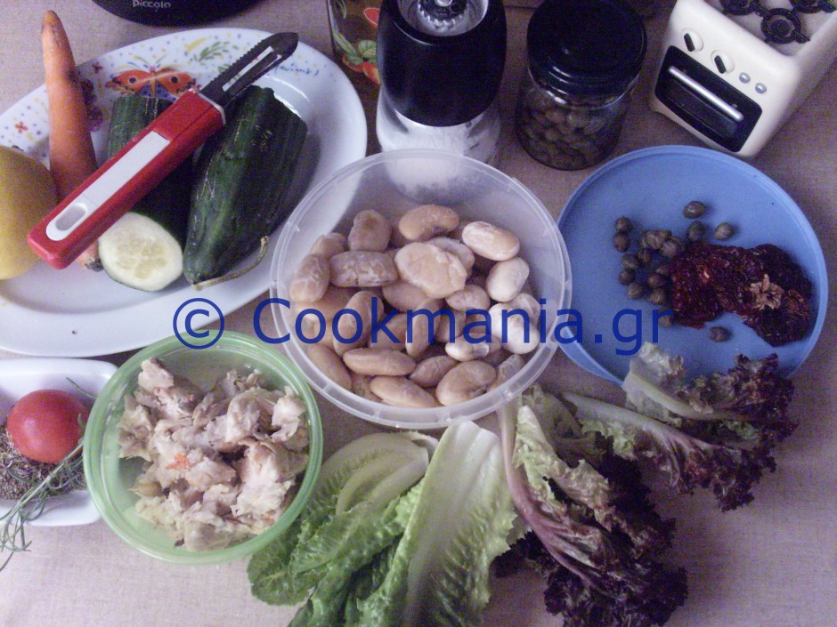 Ανακατεύουμε σε ένα μπολ τα φασόλια, το ψάρι, την κάππαρη και τις λιαστές ντομάτες και αν θέλουμε και 1 φρέσκο κρεμμύδι. Τα ρίχνουμε πάνω στα υπόλοιπα υλικά.