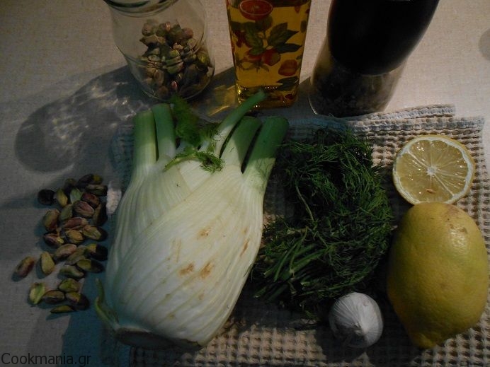 Βάζουμε και χτυπάμε τα υπόλοιπα υλικά στο multi και μαζί προσθέτουμε τα φύλλα του φινόκιο και το σκόρδο καθαρισμένο από τη φλούδα (πιέζοντας το ελαφρά με τα δάχτυλα αφαιρείται πολύ εύκολα η σάρκα από τη φλούδα).