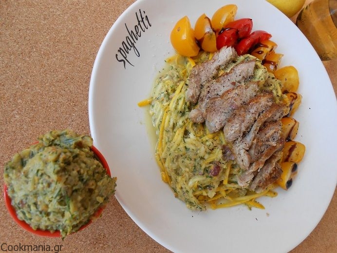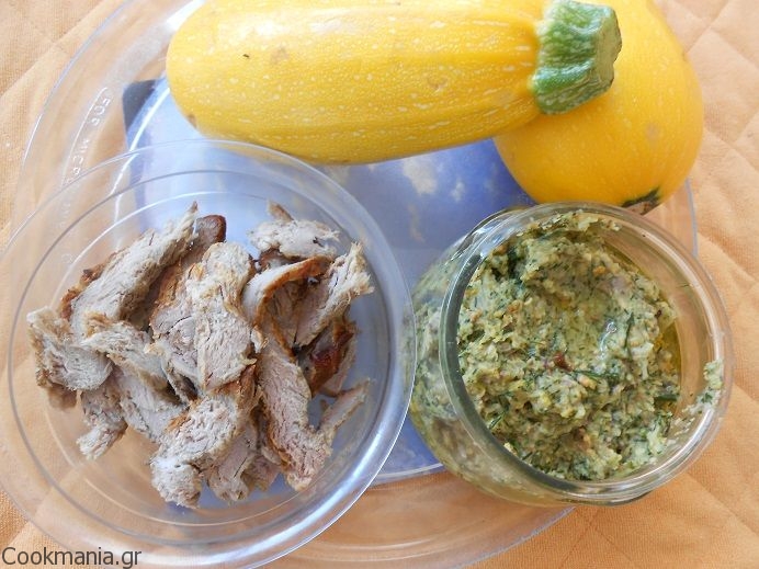 Ζυμαρικά κίτρινου κολοκυθιού με pesto φινόκιο και μοσχάρι