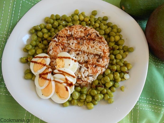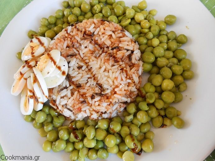 Αφήνουμε να σταθεί λίγο και ανακατεύουμε με το ρύζι. Μοιράζουμε σε πιάτα , δίπλα από τον αρακά και τοποθετούμε στο πλάι από κάθε μερίδα ή από πάνω, το αυγό.