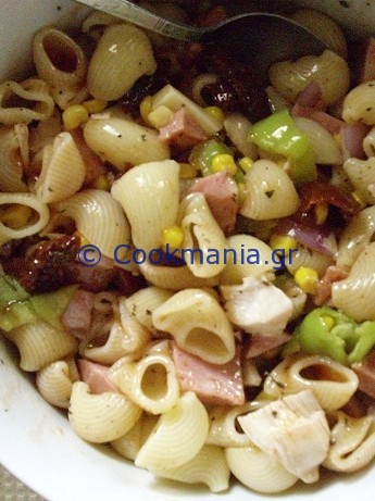 Βράζουμε τα ζυμαρικά σύμφωνα με τις οδηγίες της συσκευασίας. Τα στραγγίζουμε και τα βάζουμε σε βαθιά σαλατιέρα. Προσθέτουμε τις λιαστές ντομάτες, την πιπεριά, το καλαμπόκι, το κρεμμύδι, το κοτόπουλο, την μορταδέλα και το τυρί. Σε βαζάκι με καπάκι ρίχνουμε λάδι, την κέτσαπ, αλατοπίπερο και βασιλικό και τα ανακινούμε καλά. Περιχύνουμε με αυτό τη σαλάτα, ανακατεύουμε και σερβίρουμε.
