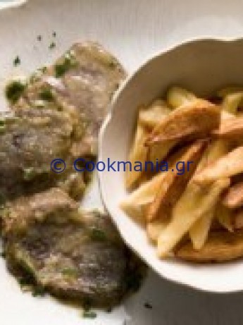 Σκουπίζουμε καλά τις φέτες μοσχαριού με χαρτί κουζίνας και τις αλευρώνουμε. Σοτάρουμε τις φέτες του κρέατος ελαφρώς σε βαθύ τηγάνι με το ελαιόλαδο μέχρι να ροδίσουν και από τις δύο πλευρές, και τις μεταφέρουμε σε πιατέλα. Pίχνουμε στο ίδιο τηγάνι το σκόρδο, ανακατεύουμε μέχρι να πάρει χρυσό χρώμα και προσθέτουμε τον μαϊντανό. Στρώνουμε τις φέτες του κρέατος σε καθαρό τηγάνι, το περιχύνουμε με το ζεστό σκόρδο και τον μαϊντανό, προσθέτουμε το ξίδι και το κρασί, και, μόλις εξατμιστεί, ρίχνουμε ένα φλιτζάνι ζεστό νερό. Pαντίζουμε με αλάτι και πιπέρι και σιγομαγειρεύουμε μέχρι να μαλακώσει το κρέας και να μελώσει η σάλτσα του. Συνοδεύουμε με πατάτες τηγανητές ή ρύζι.