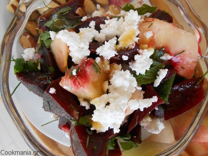 Κόβουμε τα παντζάρια και τα ροδάκινα, σε κομμάτια της αρεσκείας μας και τα βάζουμε σε ένα μπολ μαζί με την μέντα.