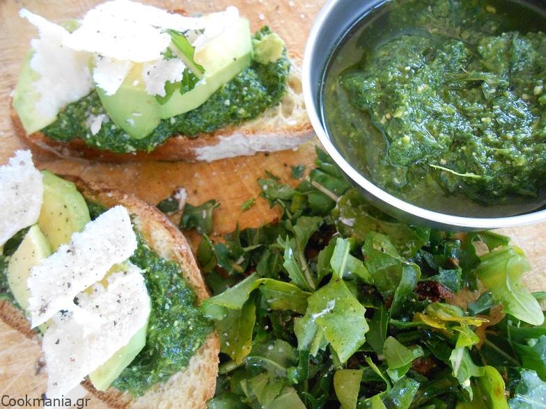 Ψήνουμε σε τοστιέρα ή στο γκριλ το ψωμί και το αλείφουμε με λίγο λάδι. Αλείφουμε με το pesto και ακουμπάμε πάνω σε πιατέλα.
