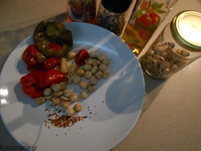 Για τη σάλτσα: Ψήνουμε τις πιπεριές, καθαρισμένες από τα σπόρια, τις ντομάτες και το σκόρδο σε αλουμινόχαρτο με λίγο λάδι , πάνω σε σχάρα, στα κάρβουνα ή σε αντικολλητικό ταψί, στο γκριλ του φούρνου για 10-12 λεπτά.