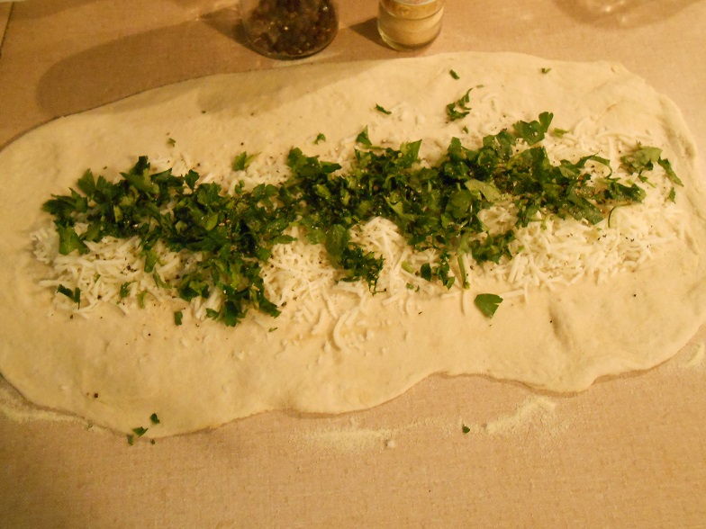 Απλώνουμε τη ζύμη σε μακρόστενο σχήμα, όπως στη φωτογραφία, πάνω σε καθαρή επιφάνεια, με τη βοήθεια του σιμιγδαλιού. Διασκορπίζουμε το τυρί, τον μαϊντανό, το σκόρδο και όσο πιπέρι θέλουμε.