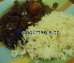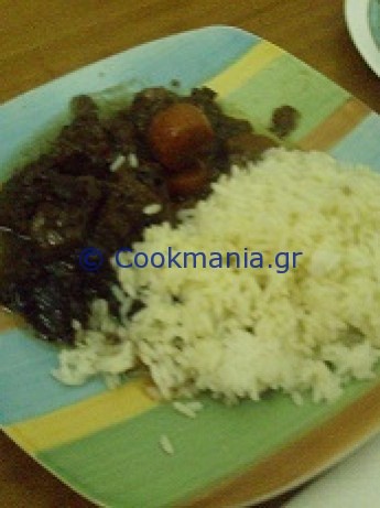 600γρ.μοσχάρι κομμένο σε κύβους Λάδι Αλατοπίπερο 10δαμάσκηνα ολόκληρα 1καρότο μεγάλο κομμένο σε ροδέλες 1ποτήρι λευκό κρασί 1κρεμμύδι τριμμένο